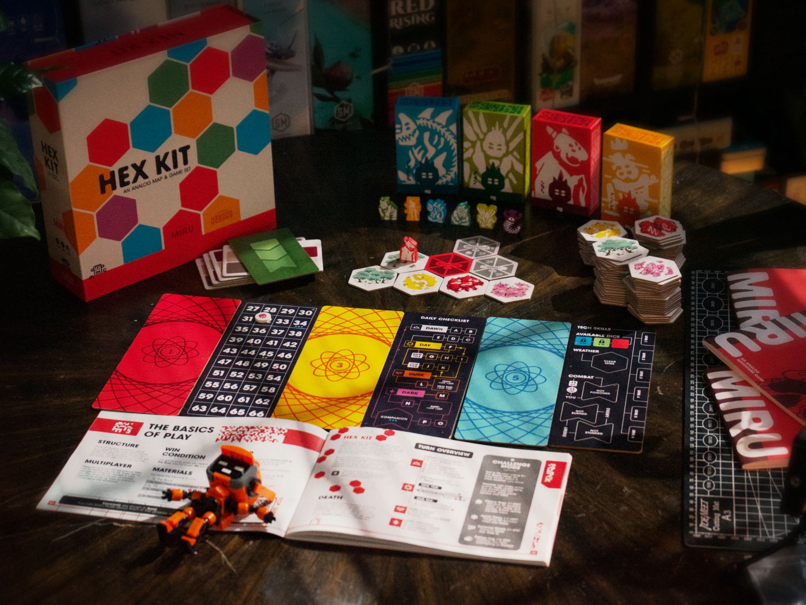 The MIRU Hex kit – is a box to store all of the MIRU books and includes hex tiles and board game components to make the miru experience even more exciting.